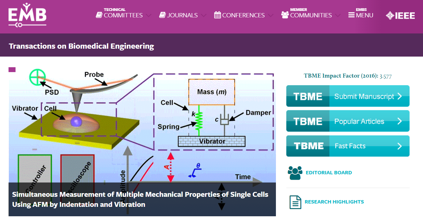 IEEE T. BioMed. Eng.每期选出具有重要原创性成果的学术论文,作为亮点成果于当期网站首页进行推荐。这是本年度继获Biophysical Journal,Lab on a Chip,Small,IEEE Transactions on Nanobioscience等封面刊载后,微纳米组科研成果再次获得国际权威期刊特别报道,表明沈阳自动化所在机器人领域不断取得新的进步,创新能力及国内外影响力稳步提升。
