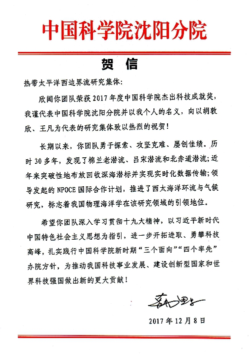 日前,中国科学院海洋研究所“热带太平洋西边界流研究集体”荣获2017年度中国科学院杰出科技成就奖。中国科学院沈阳分院院长韩恩厚致信海洋研究所,向以胡敦欣、王凡为代表的研究集体表示祝贺。