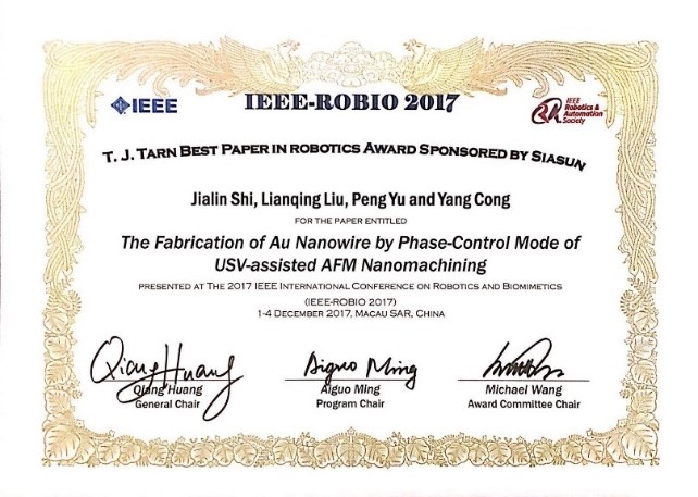 12月5日至8日,2017年度IEEE机器人学与仿生学国际会议(以下简称IEEE-ROBIO)在澳门召开,来自世界多个国家近500名机器人与仿生学相关领域的研究者和科学家参会,展示了最为前沿的科研成果。中国科学院沈阳自动化研究所微纳米课题组博士研究生施佳林与导师刘连庆研究员等合作完成的论文The Fabrication of Au Nanowire by Phase-control Mode of USV-assisted AFM Nanomachining获得了本次会议的T. J. Tarn 机器人学最佳论文奖(T. J. Tarn Best Paper in Robotics)。施佳林在会议上作口头报告,得到与会专家的好评。