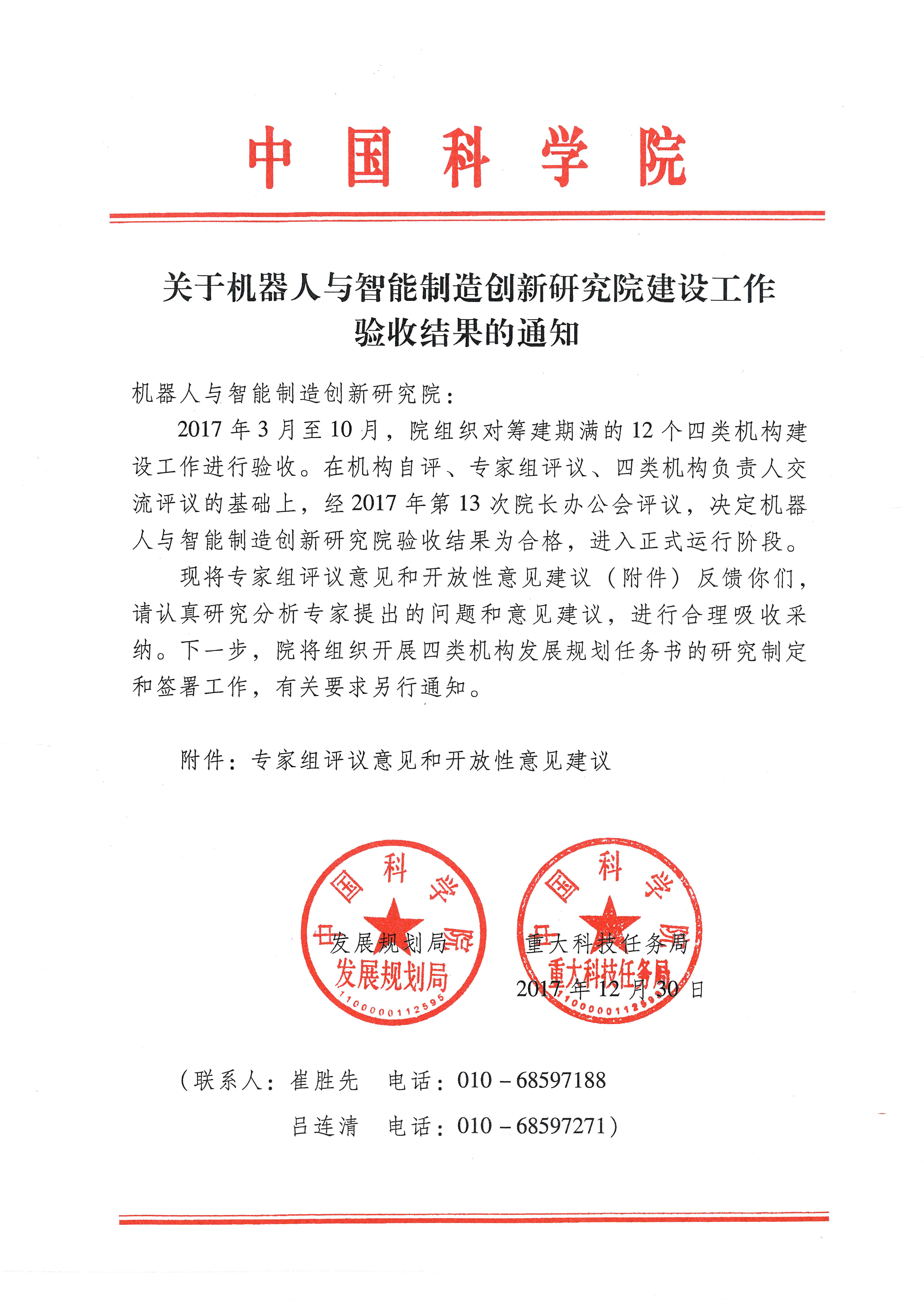 2017年10月11日,中国科学院机器人与智能制造创新研究院建设试点工作专家组验收会举行,筹建组组长于海斌汇报了创新研究院筹建工作情况。中科院副院长相里斌在验收会上指出“创新研究院定位准确,领域方向布局合理?;魅舜葱略喝嫱瓿沙锝ㄆ谀勘辍薄=?,经院长办公会评议,决定创新研究院通过验收,进入正式运行阶段。