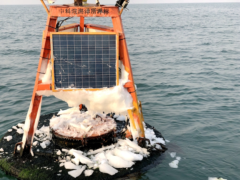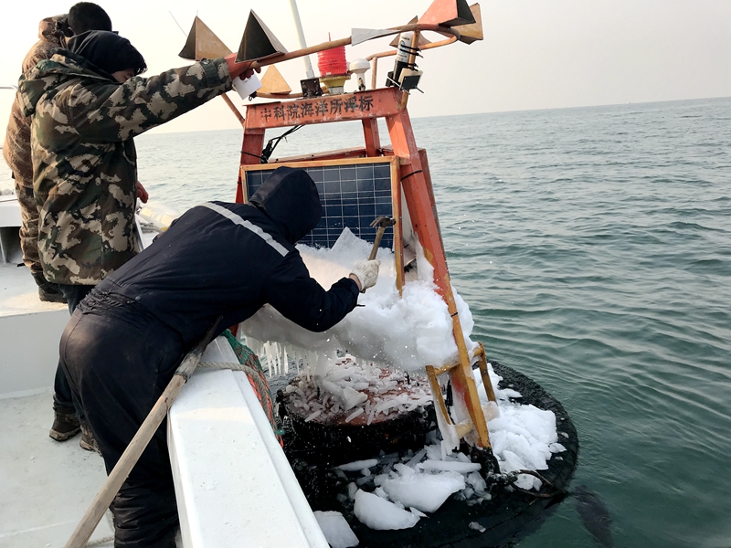 为保证春节期间近海观测网络黄海站、东海站海上观测设施的安全稳定运行,公共技术中心组织技术人员假期之前对在位运行的观测浮标系统进行了全面系统的巡检和维护。由于今冬寒潮频发,海上冰情严重,技术人员重点对北黄海海域和山东外海海域的浮标进行了除冰工作,以消除结冰对浮标供电系统的影响。