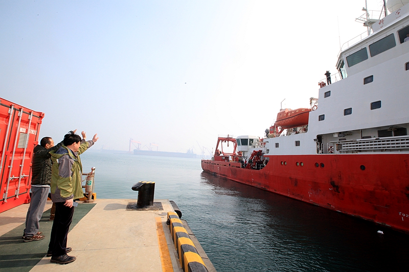 岸上同事与航次船队员挥手告别