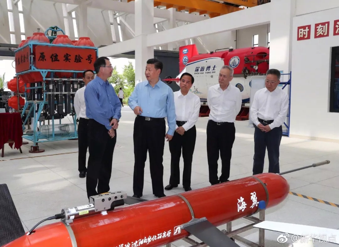 据新华社“新华视点”报道,4月12日下午,习近平总书记来到位于海南三亚的中国科学院深??蒲в牍こ萄芯克?,仔细察看“海翼”号深?;杌?、“天涯”深渊着陆器等设备,并同“深海勇士”号载人潜水器设计师和深潜团队亲切交谈。