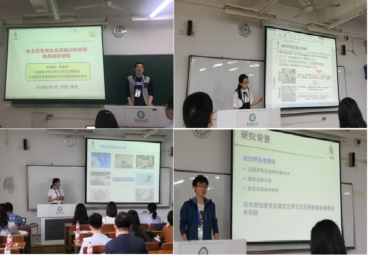5月5日上午,宋立宁副研究员主持全国生态学研究生论坛“森林生态系统与管理”分会场,博士研究生王静、卢德亮、张婷在此分会场分别做题为“动物传播胡桃楸种子对落叶松人工林林分结构变化的响应”、“基于林窗干扰的温带次生林生态系统近自然经营”、“林窗大小和林窗内位置对次生林主要阔叶树种萌生更新的影响”口头报告;博士研究生朱春雨在“生态遥感与应用”分会场做题为“东北次生林生态系统50年林窗格局动态研究”口头报告。