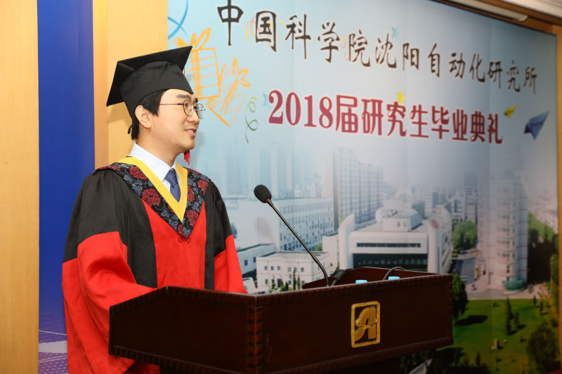 随后,2018届博士研究生施佳林代表毕业生发言。他回顾了在沈阳自动化所度过的学生岁月,表示在能毕业时见证研究所的甲子华诞感到无比的自豪和骄傲,他由衷的感谢每一位导师对自己的悉心培养和关怀,并真诚祝愿沈阳自动化所越来越好。