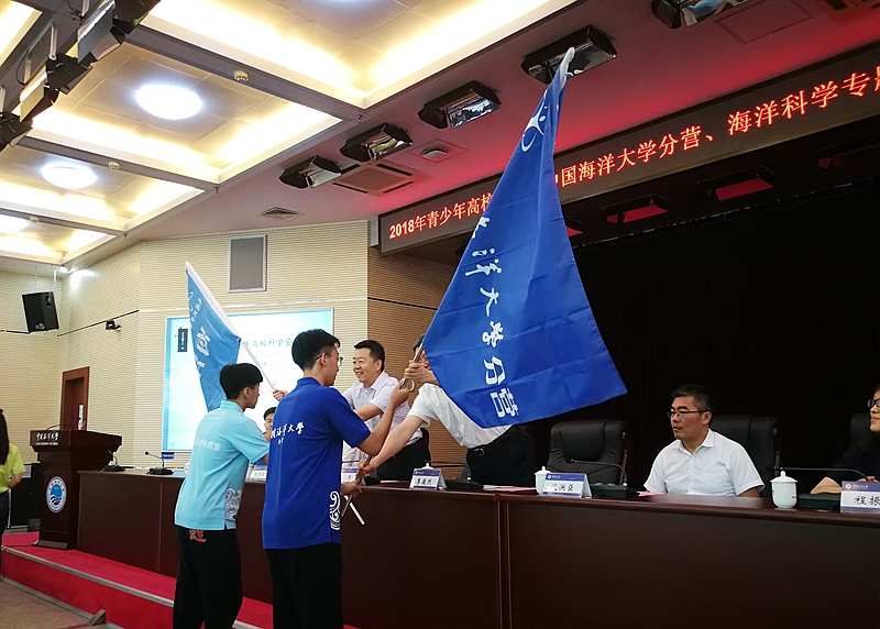 毕伟、李巍然为海洋科学专题营、中国海洋大学分营营员代表授旗