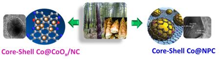 从经济和可持续发展的角度出发,开发高活性高稳定性的廉价和储量丰富的非贵金属替代稀有贵金属催化剂,实现重要能源和化工过程的高效转化是目前催化科学研究的热点和挑战之一。在前期研究基础上,该研究组继续以竹笋和廉价、低毒的非贵金属钴盐为原料,通过优化和调控制备方法和策略,构建了一类新型杂原子(N,O,或P)掺杂的具有独特核壳结构的Co纳米颗粒催化剂。研究人员充分利用生物质竹笋本身富含的杂原子源(氨基酸、蛋白质等),在没有外加入模板和活化剂的条件下,开发了一条简单、绿色并可放大制备的生物质基碳材料负载Co纳米催化剂的制备方法。所制备的催化剂具有高比表面积、大孔容、分级孔等结构特点。