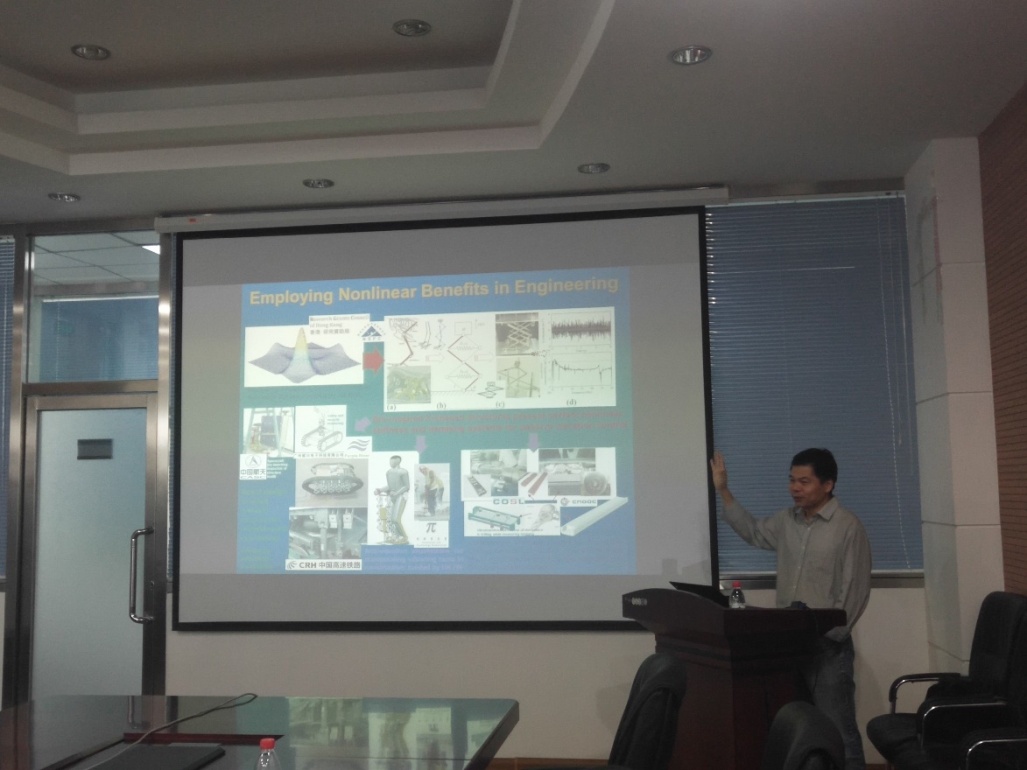 在报告中,景兴建首先详细介绍了各种非线性分析的理论方法,列举了非线性分析在故障诊断、系统辨识以及减震等方面的具体应用,包括用绝对稳定性理论进行非线性分析等。随后,景兴建介绍了他在仿生结构方面的研究成果,研制的仿骨骼结构阻尼减震系统已经进行大量的理论和实用研究,在多个方面具有应用前景。最后,景兴建就如何发表高水平论文进行了讲解,他强调理论创新和研究深度是发表论文的两大重要因素,勉励大家勤于思考,培养创新能力。他分享了自己的亲身经历,引发了与会人员的共鸣,并进行了现场交流。