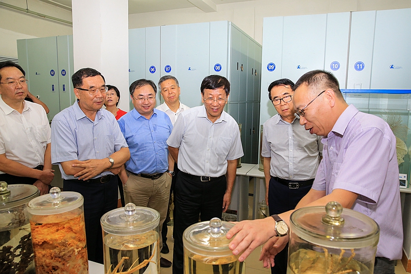 在中科院海洋生物标本馆深海样品库,曹建明副委员长听取了海洋研究所在深远海科考能力建设、深海原位探测取样及实验研究方面的重要进展及成果汇报,实地考察了海洋先导专项在西太平洋获取的深海大型生物、岩石样品及图像、视频资料。
