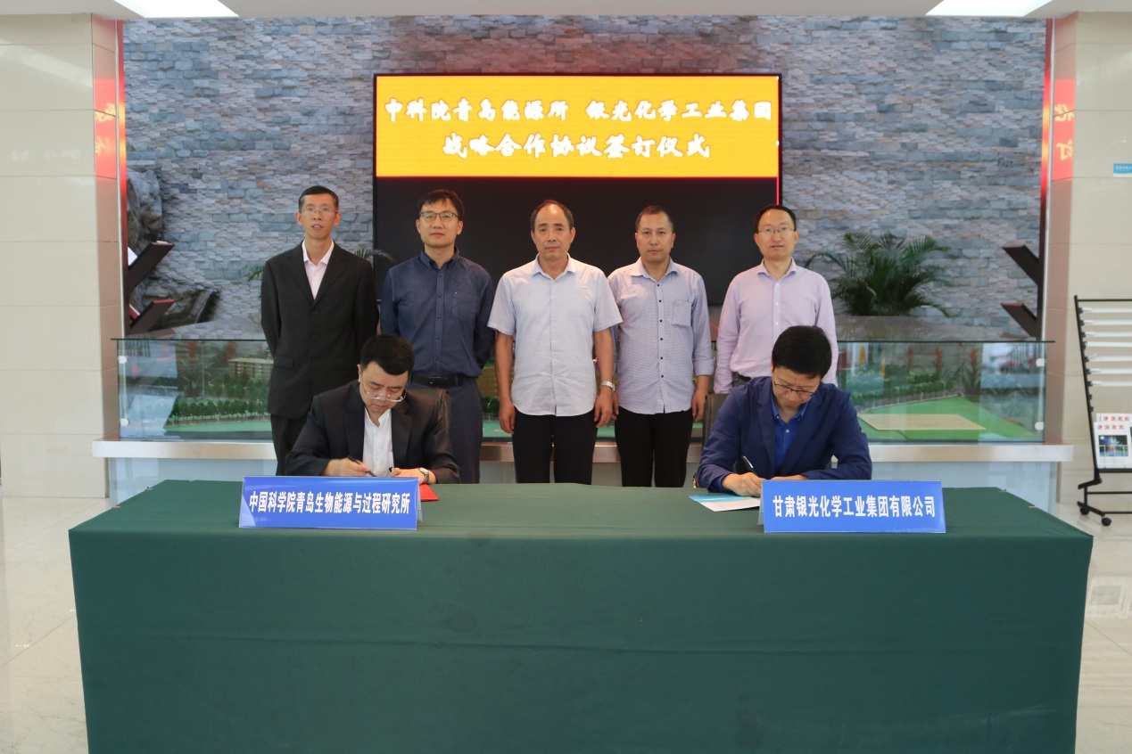 9月28日下午,中国科学院青岛生物能源与过程研究所与银光化学工业集团战略合作协议签署仪式在研究所举行。青岛能源所党委书记彭辉、银光化学工业集团总经理朱立勋分别致辞并代表双方签约。研究所科技处处长梁向峰、生物基材料组群含能材料绿色合成研究组组长冯德鑫、能源作物分子育种研究组组长付春祥、银光化学工业集团科技委委员张振中、科研所所长李志华参加了仪式。