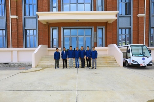 课题组工作人员赵洪涛(左三)、马越(左二)在中心大楼前