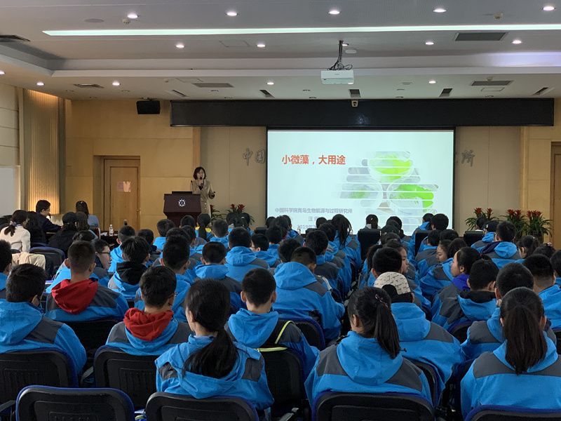 在科普报告环节中,崔光磊研究员为学生们通俗阐述了新能源的相关知识,并结合固态锂电池在新能源汽车、深海大洋探索中的实际应用例子,讲解新能源未来应用的广阔空间。汪辉副研究员以“小微藻大用途”为主题介绍了微藻的魅力,作为生物质能源的一种,微藻可以对二氧化碳进行固定,达到固碳减排的效果;微藻还具有趋光性,《最强大脑》曾用微藻表现艺术的动态变化,呈现出惟妙惟肖的画作。