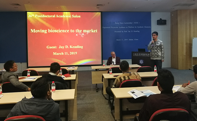 3月11日上午,中国科学院大连化学物理研究所第三十六期博士后学术沙龙在生物楼学术报告厅举行,本期沙龙主题是“Moving Bioscience to the Market”,沙龙特邀微生物学专家伯克利加州大学Jay D. Keasling教授为做客嘉宾,大连化物所青年职工、博士后、研究生等20余人参加活动。