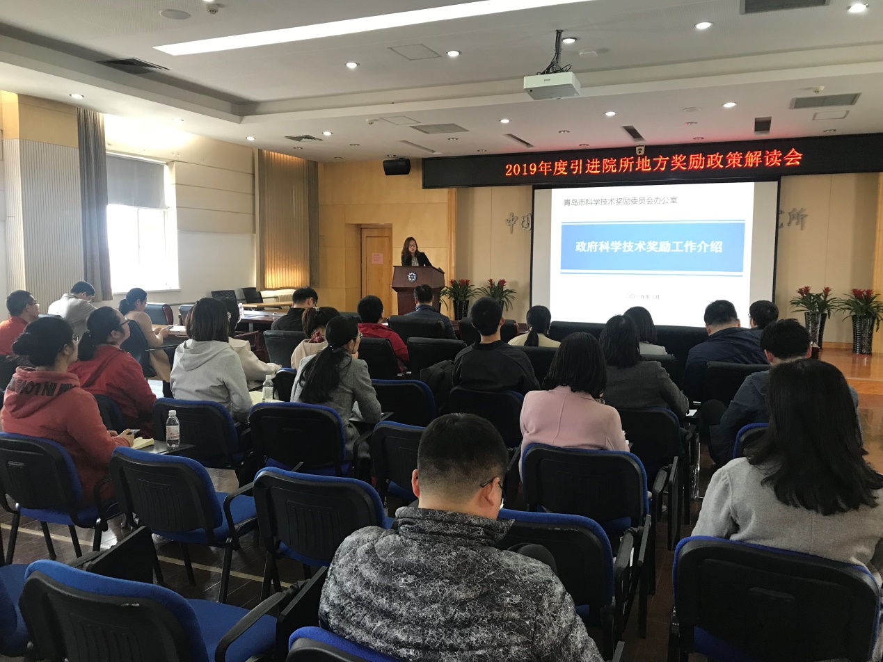 为促进驻青科研院所与地方融合发展,深入挖掘优秀成果顺利参评地方奖励,4月2日由青岛市科学技术奖励委员会办公室主办、青岛能源所承办的“2019年度青岛市引进院所地方奖励政策”专场解读会在我所顺利召开,来自青岛市二十余家科研单位以及研究所各研究组相关人员共计50余人参加了本次会议。