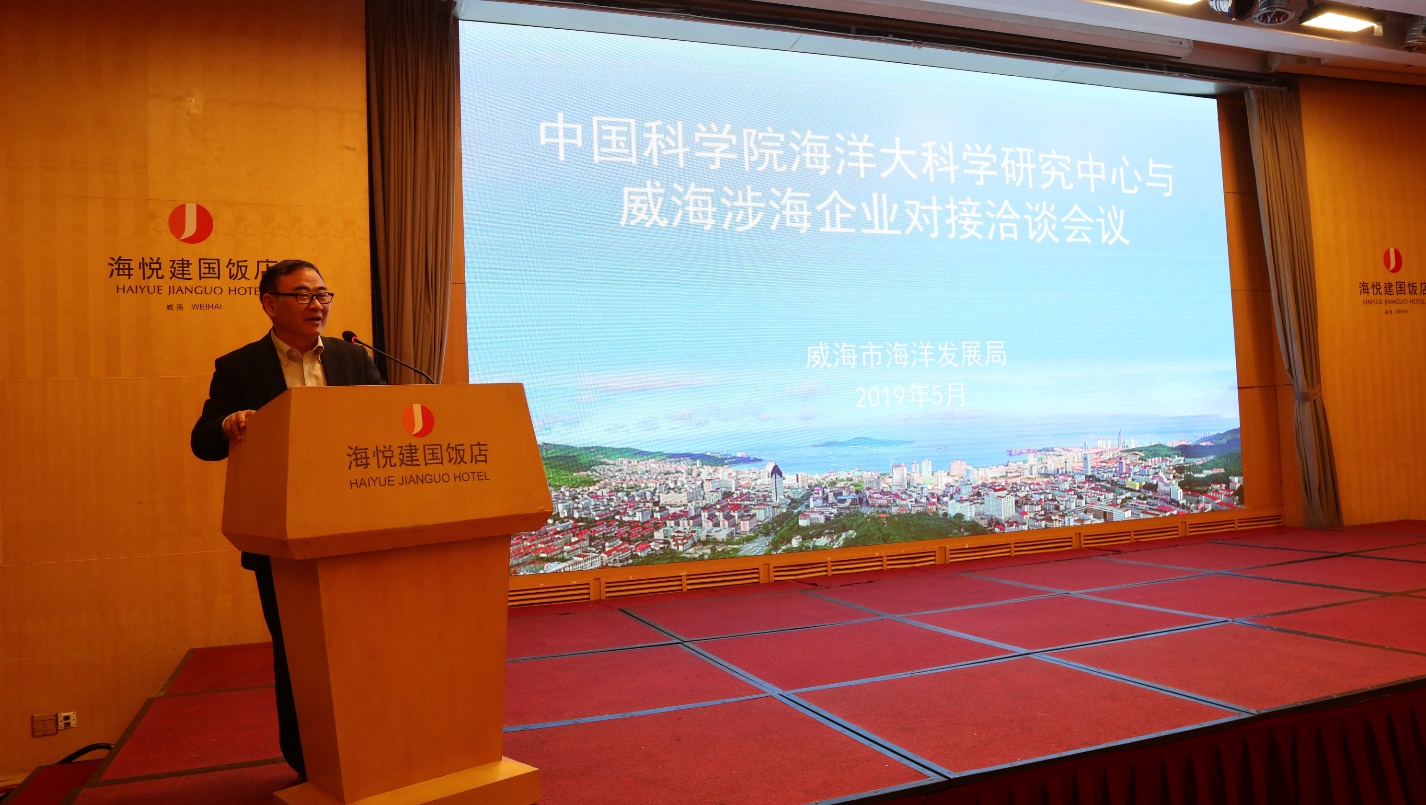 5月8日,中国科学院海洋大科学研究中心科技成果精准对接交流会在威海举行,中科院海洋大科学研究中心筹建组副组长、海洋所/烟台海岸带所常务副所长杨红生,威海市海洋发展局局长、党组书记邢海文,中科院沈阳分院科技合作处副处长、山东综合技术转化中心常务副主任王东升出席交流会。海洋大科学研究中心相关团队、威海市海洋发展局及相关区县有关部门负责人、涉海骨干企业负责人等60余人参加活动?;嵋橛赏J泻Q蠓⒄咕值餮性?、党组副书记王传良主持。