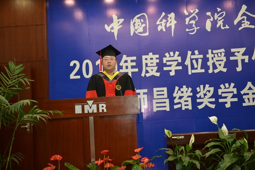 典礼最后,李美栓研究员作为导师代表致辞,李美栓研究员博士毕业于金属所,此次既是作为导师,也是作为学长,为刻苦攻读、顺利毕业的同学表达了祝福。李老师以王国维提出的人生三境界勉励毕业生:昨夜西风凋碧树,独上高楼,望尽天涯路—要站得高,看得远,要树立远大目标;衣带渐宽终不悔,为伊消得人憔悴—认定目标后,要孜孜以求、不懈努力;众里寻他千百度,蓦然回首,那人却在,灯火阑珊处—是经过千百次的努力后,发现目标就在眼前的欣喜。毕业不是结束,而是一个新起点。李美栓研究员希望毕业生们不忘初心,同时还要有感恩之心、进取之心、乐观之心、包容之心。李美栓研究员以师昌绪先生的座右铭作结:做人要海纳百川,诚信为本,忍让为先;做事要认真负责,持之以恒,淡泊名利;做学问要实事求是,勇于探索,贵在发现与创新。最后,他祝愿全体毕业生前程似锦、健康快乐!