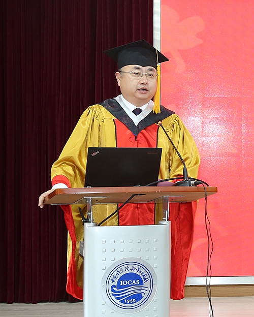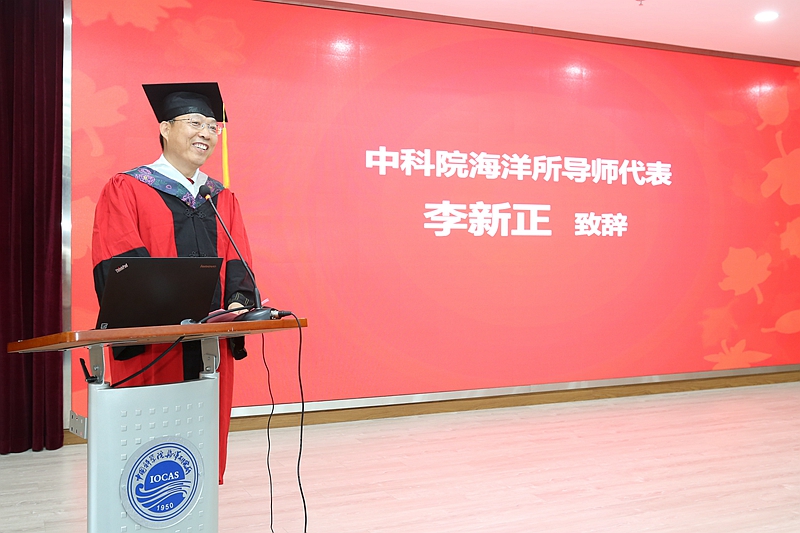 李新正研究员代表导师发言,他感谢同学们在攻读学位过程中付出的努力和做出的贡献,并勉励大家在新的学习工作岗位上继续发扬“耕海探洋、唯实求真,科技报国、创新为民”的所训所风,用奋斗书写美好的人生画卷。