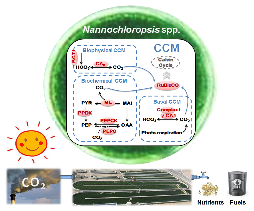 人类社会排放的CO2等温室气体,造成全球气候变暖和海洋酸化,探索和实施碳减排途径和方法已刻不容缓。利用微藻将工业源CO2直接转化为生物燃料,在碳中性能源体系的建设中具有重要的战略意义。但是,工业微藻如何高效固定CO2呢?青岛能源所单细胞中心等发现,作为一种工业产油微藻,微拟球藻细胞集至少三种碳浓缩机制(CO2 Concentrating Mechanism,CCM)的特征于一身。这一全局性的CCM系统结构蓝图的揭示,为在工业微藻中设计和改造“超级二氧化碳固定??椤钡於嘶?。 目前地球大气中的CO2含量约0.04%。为了将环境中如此低浓度的CO2富集在叶绿体中Rubisco(核酮糖-2-磷酸羧化氧化酶)的周围,从而进行高效的光合作用,自养生物进化出了形形色色的CCM系统,在细胞代谢网络中主动地供应或回收无机碳分子。因此,CCM系统蕴含着挖掘和改造微藻细胞工厂固碳能力的奥妙。