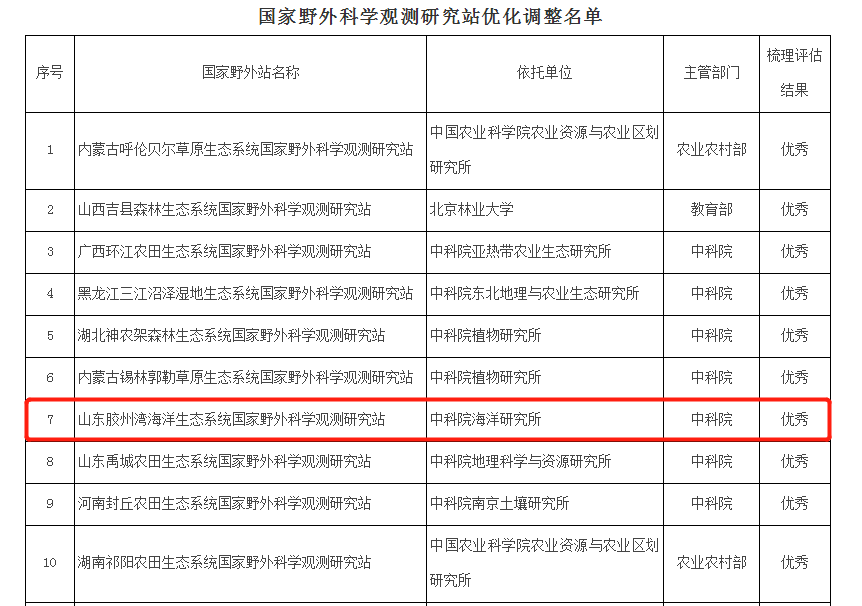 日前,在科技部组织的国家野外站梳理评估工作中,以中科院海洋所为依托单位的“山东胶州湾海洋生态系统国家野外科学观测研究站”获评优秀。