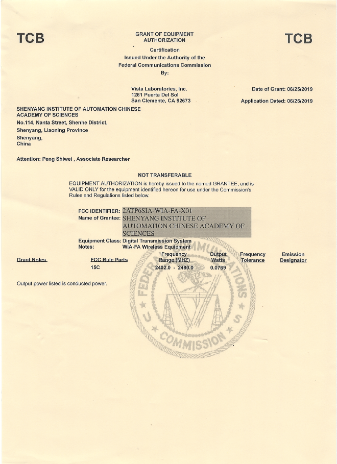 近日,由中国科学院沈阳自动化研究所开发的面向工厂自动化应用的高实时、高可靠无线通信网络产品WIA-FA,顺利通过美国FCC(Federal Communications Commission,美国联邦通信委员会)认证并获得证书。