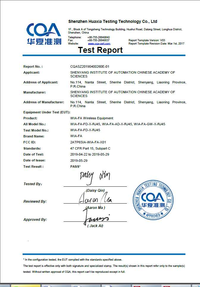 WIA-FA是工业物联网的核心技术,是工厂自动化生产线实现在线可重构的重要使能技术,对推进制造业由传统的低成本大批量生产模式向高端高附加值的个性化生产模式转变,助推制造业的转型升级具有重要意义。此次WIA-FA 产品能够顺利通过FCC认证,证明沈阳自动化所在产品整机设计尤其是电磁兼容设计领域具有足够的知识积累和技术储备,也为WIA-FA产品将来推广美国市场垫定了坚实的技术基础。
