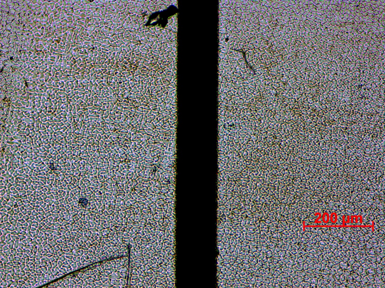 水导激光技术特别适用于难加工材料,比如对厚度4mm的碳纤维复合材料进行切割后,加工区边缘无毛刺,层间纹理清晰(如图1所示),解决了当前碳纤维复合材料常规技术加工后存在毛刺的问题。切割不锈钢材料后,加工区域边缘平直,无重融层和热影响区(如图2所示),解决了当前超快激光加工中的结构锥度问题。