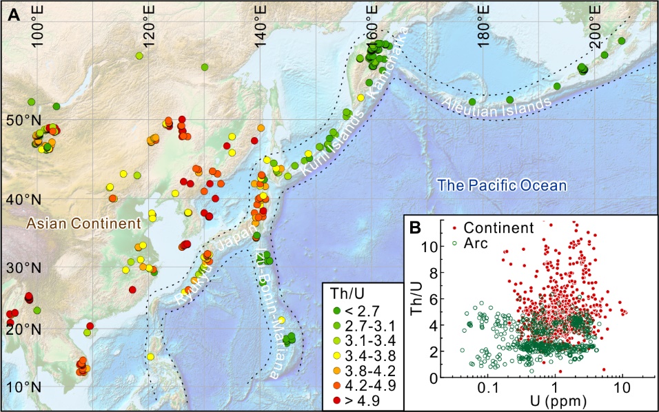 孙卫东研究员指导其博士后刘鹤,联合国外科学家以全新手段和视角对全球性氧化事件的发生时间进行了限定。研究发现,在当今地球上,形成于阿留申群岛、堪察加半岛、千岛岛弧、日本群岛和琉球群岛的弧岩浆岩中Th元素含量和U元素含量的比值(Th/U)明显低于亚洲东部的内陆型岩浆岩。Th和U是地球化学性质十分相近的两种元素,因此不同岩性的岩浆岩中的平均Th/U基本保持一致?;⊙医揖哂械?/span>Th/U的原因是在大气和海水中氧气的氧化作用下,地表河流和海水中的U元素主要以溶于水的U6+形式存在,但Th元素仍以不溶于水的Th4+形式存在,致使现代海水中的U元素含量远高于Th元素含量,从而造成蚀变的海底洋壳具有低Th/U。这些蚀变洋壳在沿俯冲带向深部俯冲过程中,通过洋壳脱水等作用将其低Th/U的特征随着流体运移最终带入到俯冲带上方形成的弧岩浆岩中。