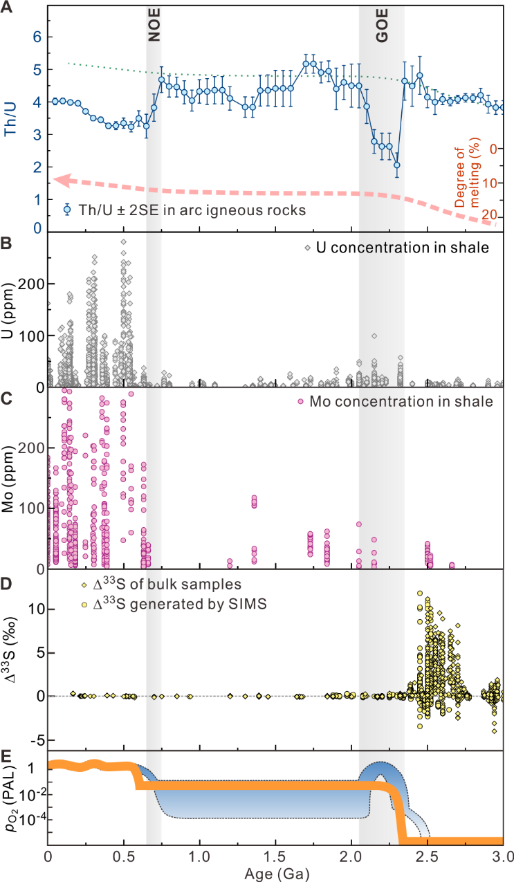 在地球早期大气和海水中均没有氧气的情况下,蚀变洋壳不会具有低Th/U特征,当时板块俯冲作用所形成的弧岩浆岩Th/U也不会降低?;谡庖簧柘?,刘鹤等人从全球岩浆岩数据库中筛选了30亿年前至今形成的所有中酸性弧岩浆岩的地球化学数据,以统计学方法计算出全球弧岩浆岩的Th/U随时间的变化规律。结果发现,弧岩浆岩的平均Th/U在地质历史时期的两次大幅度降低刚好记录了大约24亿年前和大约7.5亿年前两次全球性氧化事件的发生。