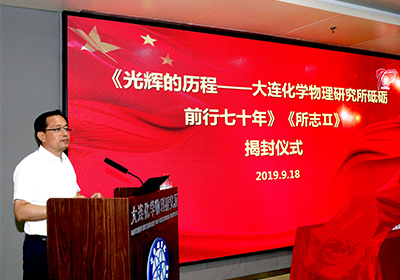 七十载栉风沐雨,大海扬波。在新中国成立七十周年之际,为弘扬和传承大连化物所文化精神,献礼70周年所庆,9月18日下午,中国科学院大连化学物理研究所隆重举行《光辉的历程——大连化学物理研究所砥砺前行七十年》《所志 》揭封仪式。中科院科学传播局局长周德进、离退休干部工作局局长黄向阳,大连化物所党委书记王华、党委副书记毛志远、离退休老领导,以及两部出版物的作者、编委代表出席了仪式。仪式由毛志远主持。