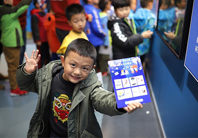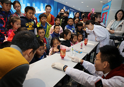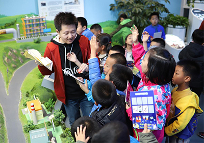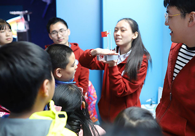 本次科学节活动共设有“追忆报国之路”“走近科学大家”“探秘科技小镇”“玩转炫酷实验”和“共赏化学之美”5个环节?;疃劳兴构菔状谓饕褰逃谌肟破栈疃校白芬浔ü贰薄白呓蒲Т蠹摇钡幕方诮彩龃罅锼恕翱萍急ü?、勇争一流”的理想与信念,弘扬老一辈科学家爱国奉献的家国情怀,激励孩子们把自己的科技梦想和伟大祖国复兴的中国梦相融合,让科技报国的种子在孩子们心中生根发芽。针对孩子们的特点和需求,活动在“探秘科技小镇”推出了9个兼具科学性、体验性和互动性的展点,让孩子们在场景中更好地体会科技给生活带来的改变。在“玩转炫酷实验”环节,观赏性和体验性超强的“牛奶彩虹”和“火山喷发”小实验,让孩子们在“玩”中获得知识,体验了科学的“奇妙”?;疃咕侔炝恕肮采突е馈鄙阌?、绘画展,将科学与艺术相融合,让孩子们领略科学之美。