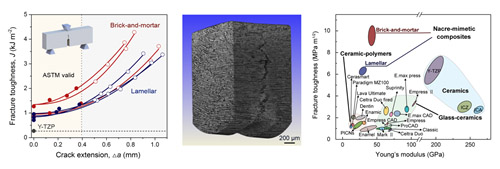 近期,中国科学院金属研究所材料疲劳与断裂实验室刘增乾研究员和张哲峰研究员与美国加州大学伯克利分校的Robert O. Ritchie教授以及吉林大学开展合作,他们结合生物力学原理,采取组成复合化和组织结构仿生化设计,将临床应用的氧化锆陶瓷与生物相容性树脂相结合,通过模仿天然贝壳珍珠层的微观组织结构,设计研发了硬度、强度和模量均与人体正常牙齿(包括牙釉质和牙本质)完全匹配的新型氧化锆-树脂仿生复合义齿材料。新型义齿材料微观上具有与天然贝壳类似的组织结构,氧化锆以片层形式平行排列或以“砖墙”形式紧密堆叠,其间的空隙以树脂填充,如图1所示。同时,他们提出了能够准确描述并预测仿生材料模量的力学模型,并且通过调控材料的微、纳米尺度组织结构,实现了新型义齿材料的硬度、强度和模量与人体正常牙齿的完全匹配。