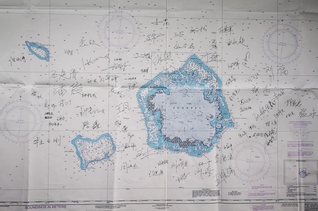 经过四十多天的并肩奋斗,来自不同单位的科考人员从陌生到熟悉,结下了深厚的友谊。部分科考队员已经完成航次任务,将在靠港波纳佩后返程回国。在“科学”号“海上堡垒”临时党支部书记杜玉刚同志提议下,全体船队员在一张旧海图上签下自己的名字,把这段难忘的出海经历及深厚友谊定格在海图上。