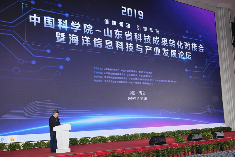 11月15日,由山东省科学技术厅、中国科学院沈阳分院、青岛市科学技术局联合主办、青岛西海岸新区管委和中国科学院海洋大科学研究中心共同承办的“中国科学院-山东省科技成果转化对接会暨海洋信息科技与产业发展论坛”在青岛举行。吴立新院士、夏佳文院士、宋君强院士等知名专家学者,山东省科技厅、中科院条件保障与财务局、中科院沈阳分院、山东省发改委、山东省海洋局、青岛市有关部门负责同志,以及来自中科院16家院属单位、山东省15个地市科技相关部门、省内外160余家企业、部分高校和科研机构等近500人参加活动。山东省科技厅党组成员、青岛国家海洋科学研究中心主任李储林致辞并主持开幕式。青岛西海岸新区副区长隋斌、青岛市海洋发展局局长苟团年、青岛市科技局局长吕鹏、中科院沈阳分院副院长马越红分别致辞。
