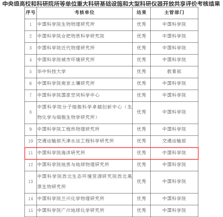 11月19日,科技部办公厅和财政部办公厅联合发布2019年中央级高校和科研院所等单位重大科研基础设施和大型科研仪器开放共享评价考核结果。本次考核共有25个部门344家单位参加评价考核,中科院海洋所因管理制度规范,科研仪器设备运行使用效率高,对外开放共享成效明显,在52个获评优秀单位中列第11名。这是海洋所连续二年在中央级大型仪器开放共享评价考核中获评优秀。