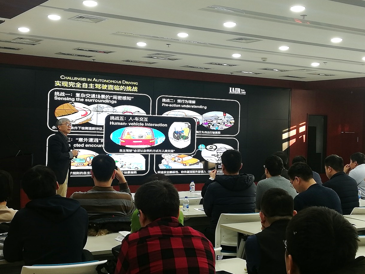 在科研工作方面,作为我国率先开展无人驾驶及辅助安全驾驶的研究团队之一,郑南宁介绍了目前无人驾驶的研究现状,深入分析了无人驾驶汽车要适应复杂的交通环境仍面临的五大挑战。他分享展示了团队研发的无人驾驶汽车在中国智能车挑战赛上的精彩表现,其在城乡道路、高架快速道路以及高架快速道路的真实交通流状态下的汇入车流和动态超车等复杂路况下能够平稳驾驶。