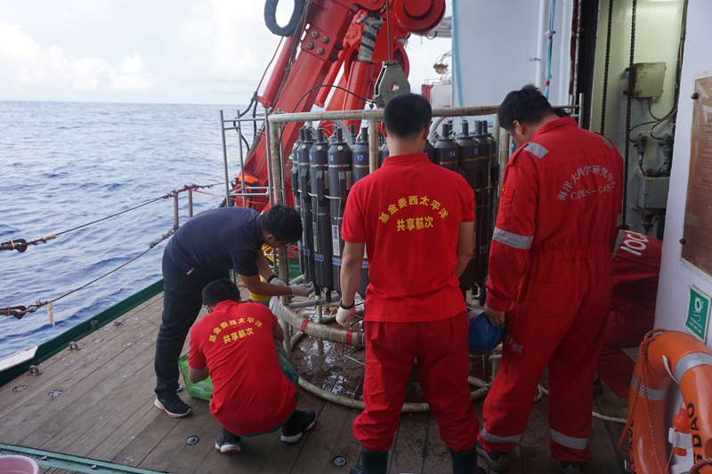 航次搭载的国家自然基金项目在多个前沿领域取得重要进展。中科院海洋所孙虎元研究员首次进行了3000米以深分层海水腐蚀性试验,获得西太平洋5000米深度国产X80钢腐蚀速率的连续观测数据。厦门大学黄邦钦课题组首次在西太平洋沿赤道断面获得了大空间尺度的高分辨率、高灵敏度浮游生物呼吸数据。中科院海洋所郭术津博士首次调查了马里亚纳海沟邻近海域固氮蓝藻的生物量及其垂直分布。中国海洋大学杨桂朋课题组首次对西太平洋海域生源硫化物实现空间大尺度观测。华东师范大学李道季课题组针对西太海域深层水中微塑料赋存特征使用了大体积(8吨)原位过滤方法,解决了深海采样体积不足等问题。此外,航次还获取了海洋上1500米层高空间分辨率湍流结构剖面数据,为低纬度西太平洋湍流混合研究提供了重要基础。这些观测将极大地推动我国在西太平洋海洋科学与技术相关领域取得持续突破。
