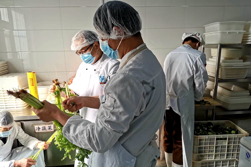 疫情期间,为防止人员聚集,研究所鼓励轮值办公和居家办公,研究生也没有开学,因此每天就餐人数大概是平时的五分之一,南海路园区两个食堂暂时关停了一个。今天食堂一共有12位工作人员到岗,大家统一穿着工作服,配带口罩,择菜、洗菜、切菜、和面……各司其职,分工合作,有序准备着职工的午餐。