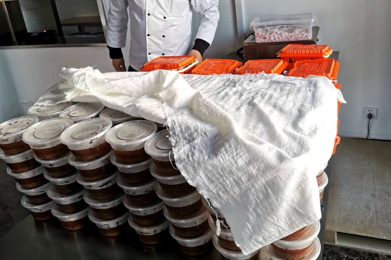 今天的供餐数量是160份,这对食堂工作人员也是一个不小的压力。上午10点半,所有的菜品已准备完毕,开始进行套餐的盒饭分装。今天的套餐A是“皮五花肉炖土豆-尖椒烧茄子-蒜蓉油菜-米饭-馒头”,套餐B是“炸刀鱼-青椒炒肉片-西红柿炒鸡蛋-米饭-馒头”,包子是芹菜肉包,汤是八宝粥,看上去非常诱人。分装好的盒饭整齐地摆放在食堂大厅,用专用的罩布进行保温,静静等待开饭时间。