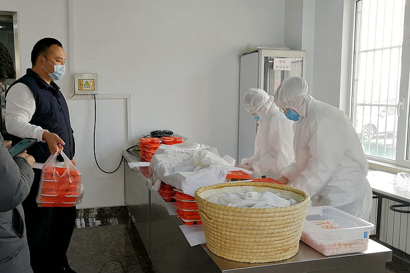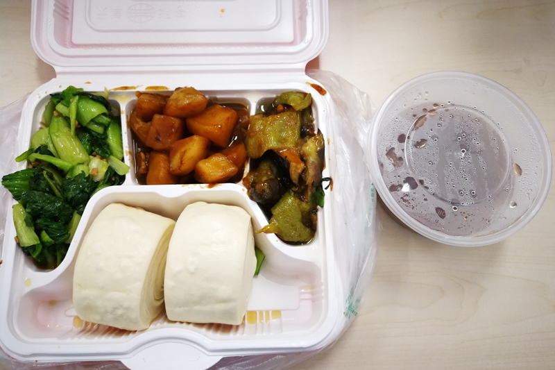 新冠肺炎疫情发生以来,为减少人员聚集,食堂取消了堂食,以盒饭套餐形式供餐。每天早上9点,各部门订餐联络人将本部门当天所需午餐数量反馈给王保新,他会根据实际需求掌握备菜数量。为了确保营养均衡并照顾大家的口味,每天的套餐分成了AB两种,配套一份汤,每种套餐的主食都可以自选米饭或者面食。另外,还有单独的包子等进行供应。