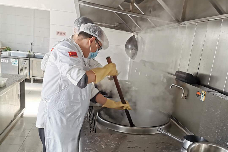 科学防疫,重在防范。正式开工前,海洋所对食堂工作人员及家属的健康状况进行了深入摸底,要求外地返青人员在家进行自我隔离,并对食堂进行了彻底消毒,以保证食堂作业的环境卫生和人员健康。疫情防控期间,食堂工作人员的“规范操作流程”又多了好多条规矩:每天进行体温检测,工作过程中必须全程佩戴口罩,每日对食堂及周边环境进行清洁消毒并做好记录,禁止采购活禽及不明来源食材,严格执行烹饪食品的温度和时间标准……彻底防范和切断病毒的传播途径。