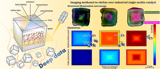 最近,该团队将多尺度反应-扩散模型与超分辨结构照明成像相结合,实现了甲醇制烯烃工业级别SAPO-34分子筛晶体内反应与扩散过程成像,可直接获取反应中反应物和产物分子、积碳物种以及酸性位点的时空分布与演化。研究发现,在甲醇制烯烃过程中,分子筛的晶体粒度可以改变活性中间体(芳烃烃池物种)的空间初始落位,直接决定客体分子与催化剂中酸性位点以及活性中间体的可接触性和利用率,从而对甲醇制烯烃宏观反应性能产生显著影响。该方法还被进一步用于定量描述甲醇制烯烃过程分子筛催化剂快速失活的过程。该研究实现了介尺度模型和时空分辨光谱技术的结合,不仅能够促进理解甲醇制烯烃过程分子筛催化剂反应扩散历程,对分子筛催化剂设计和甲醇制烯烃工艺过程优化具有重要意义,同时为研究非均相催化反应中分子筛晶体中客体分子时空演化行为提供了新思路。