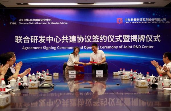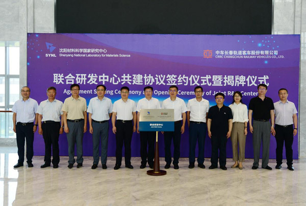 7月15日,沈阳材料科学国家研究中心(以下简称“国家研究中心”)与中车长春轨道客车股份有限公司(以下简称“中车长客”)共建联合研发中心协议签约暨揭牌仪式在中车长客举行,辽宁省副省长、沈阳材料科学国家研究中心主任、中国科学院院士卢柯,吉林省副省长、中国科学院院士安立佳,中车长客总经理王锋、总工程师沙淼,国家研究中心副主任张劲松、李秀艳等领导和专家出席仪式。