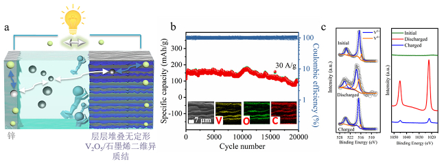 为解决这一难题,该团队采用二维模板离子吸附策略,将无定形V2O5均匀自组装在高导电的石墨烯表面,成功获得了一种层状V2O5/石墨烯二维异质结新材料。该材料充分结合了无定形V2O5本征缺陷丰富、离子扩散路径短和石墨烯导电性高、机械稳定性良好的优点以及层状结构的保护作用,缓解了钒溶解问题,实现了高效离子-电子协同传输,该团队利用该材料构建出了超长寿命、高安全的水系锌离子电池。基于无定形V2O5和石墨烯的强协同作用,该电池在0.3 A/g下表现出447 mAh/g的高容量,同时在30 A/g的大电流密度下,循环20000圈,依然保持83.9%的初始容量。同时,该团队采用准原位XPS测试证明了Zn2+的可逆嵌入脱出。此外,该团队以该异质结为正极、锌为负极构建了平面化微型锌离子电池,器件获得了49 mWh/cm3的高体积能量密度、长寿命以及良好的集成特性,证明了其作为安全性能高、成本低的可穿戴储能器件的潜力。该工作为发展高效电子-离子协同增强的二维异质结材料提供了新策略,为构建水系高效微型电化学能源器件提供了新思路。