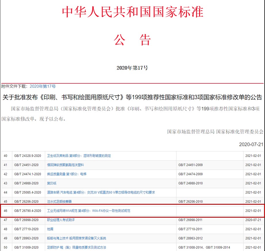 近日,由中国科学院沈阳自动化研究所牵头制定的“工业无线网络WIA规范 第4部分:WIA-FA协议一致性测试规范”正式发布,成为中华人民共和国国家标准(国家标准编号为GB/T 26790.4-2020),并将于2021年2月1日出版实施。