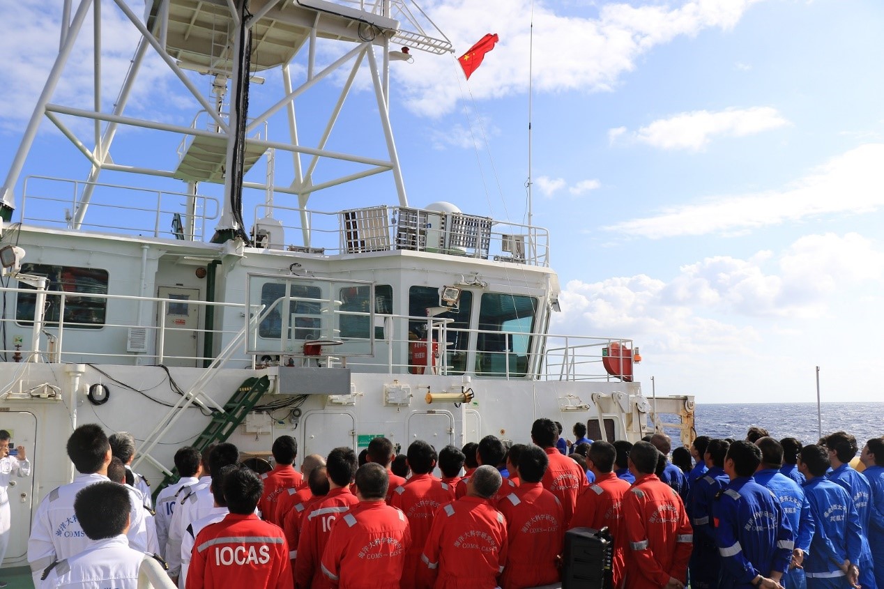 为庆祝中华人民共和国成立71周年,10月1日,顺利完成国家自然科学基金委西太平洋开放共享航次的“科学”号科考船在返航途中举行国庆海上升国旗仪式。