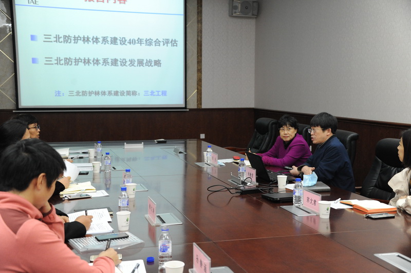 首先,郝欣代表沈阳生态所欢迎九三学社辽宁省委课题组来所调研。米志芳介绍了课题组成员及本次调研的重点。朱教君研究员作为我国防护林领域专家,向调研组介绍了三北防护林体系建设40年综合评估的情况,包括工程的成效、经验、存在问题与对策建议,以及针对辽宁省域开展三北工程建设提出相关问题和建议。随后,双方就三北工程在辽宁省实践中的具体问题进行了热烈交流和研讨。
