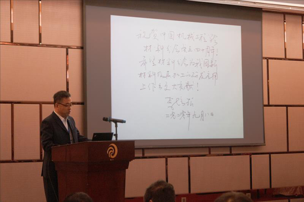 中国机械工程学会材料分会总干事长胡军展示了中国机械工程学会理事长、历届材料分会主任委员与部分院士专家题词