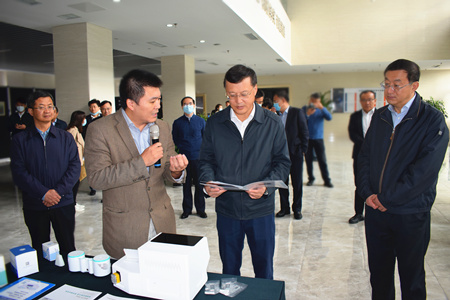 杨军一行听取了微生物制造工程中心吕雪峰研究员有关螺旋藻生产甘油葡糖苷技术和微生物发酵制备反式乌头酸技术的产业化应用成果、单细胞中心徐健研究员有关团队研发的国际上首台高通量流式拉曼分选仪及掌上型新冠病毒快检仪的汇报,深入了解了科研产品与实验装置。