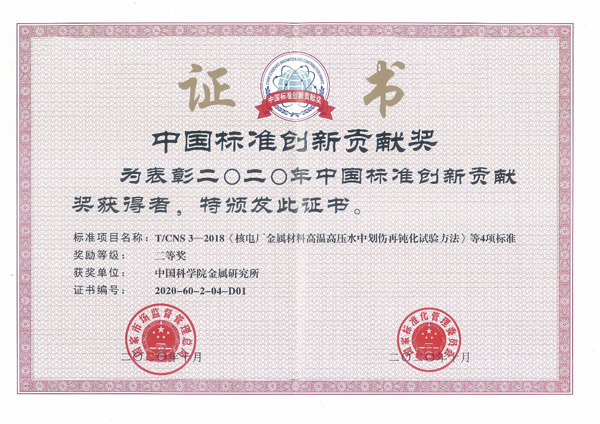 10月14日,在世界标准日当天,市场监管总局(标准委)正式发布了《关于2020年度中国标准创新贡献奖授奖的决定》,揭晓了2020年中国标准创新贡献奖表彰名单。金属所中科院核用材料与安全评价重点实验室牵头编制的《核电厂金属材料高温高压水中划伤再钝化试验方法》(T/CNS 3—2018)等4项中国核学会团体标准荣获标准项目奖二等奖。
