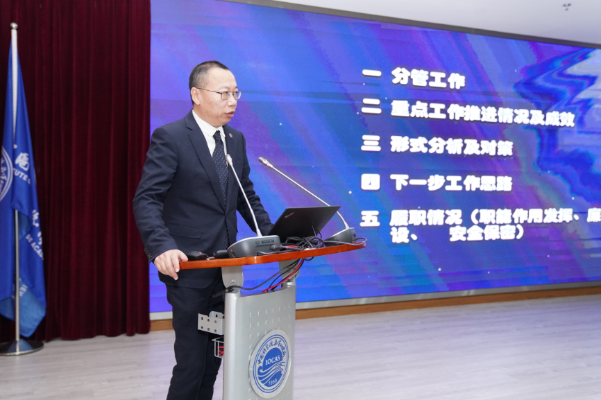 会上,党委书记王辉,常务副所长杨红生,副所长李超伦,党委副书记、纪委书记毕伟分别就个人分管工作作专题报告和个人述职述廉。各实验室主任分别汇报了研究室2020年工作进展及2021年发展思路。